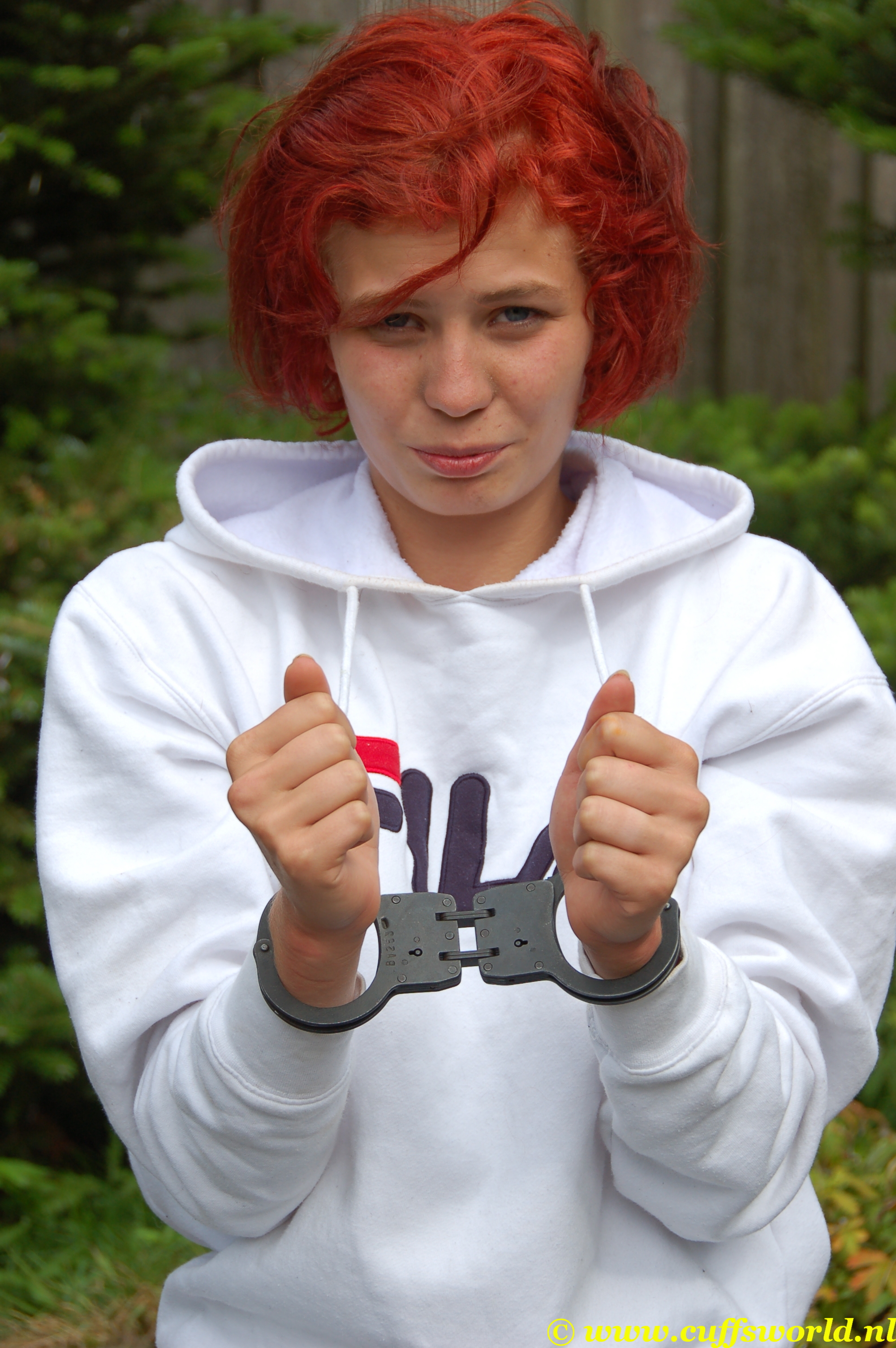 An other picture set with our red haired model Eva, she is dressed up with a lightblue and tight jeans a nice white Fila hoodie ans on her feet a pair of beautiful sneakers, al we can do is make the finishing tough with a black pair of russian BRS-3 convoy Handcuffs, and cuffed her to pole