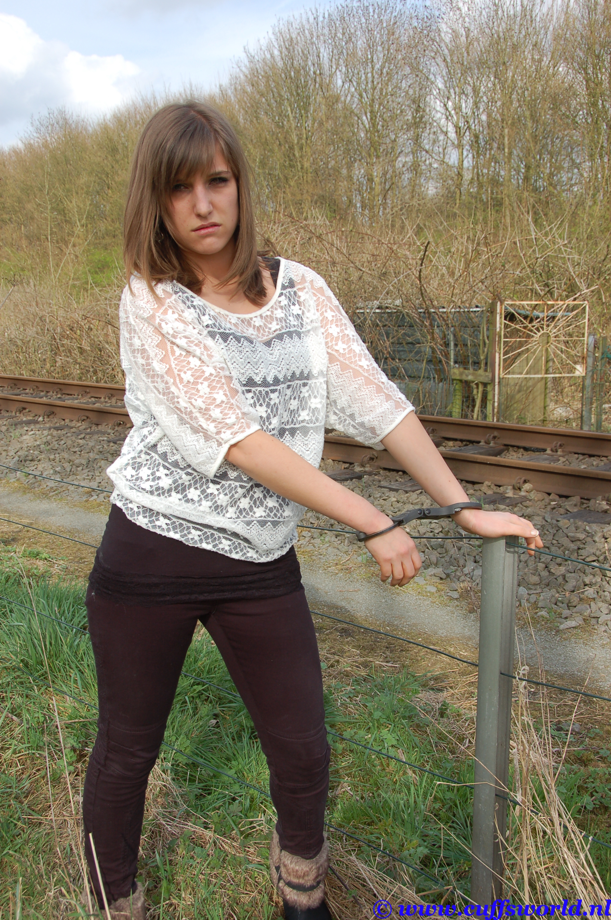 For this set we take our beautiful model Kimm outside because the weather was fine. We only have a singele set of Black Dutch hinged handcuffs with us. Not much but one pair of cuffs must be enough to keep her captured as long as needed for this pifcyure set.