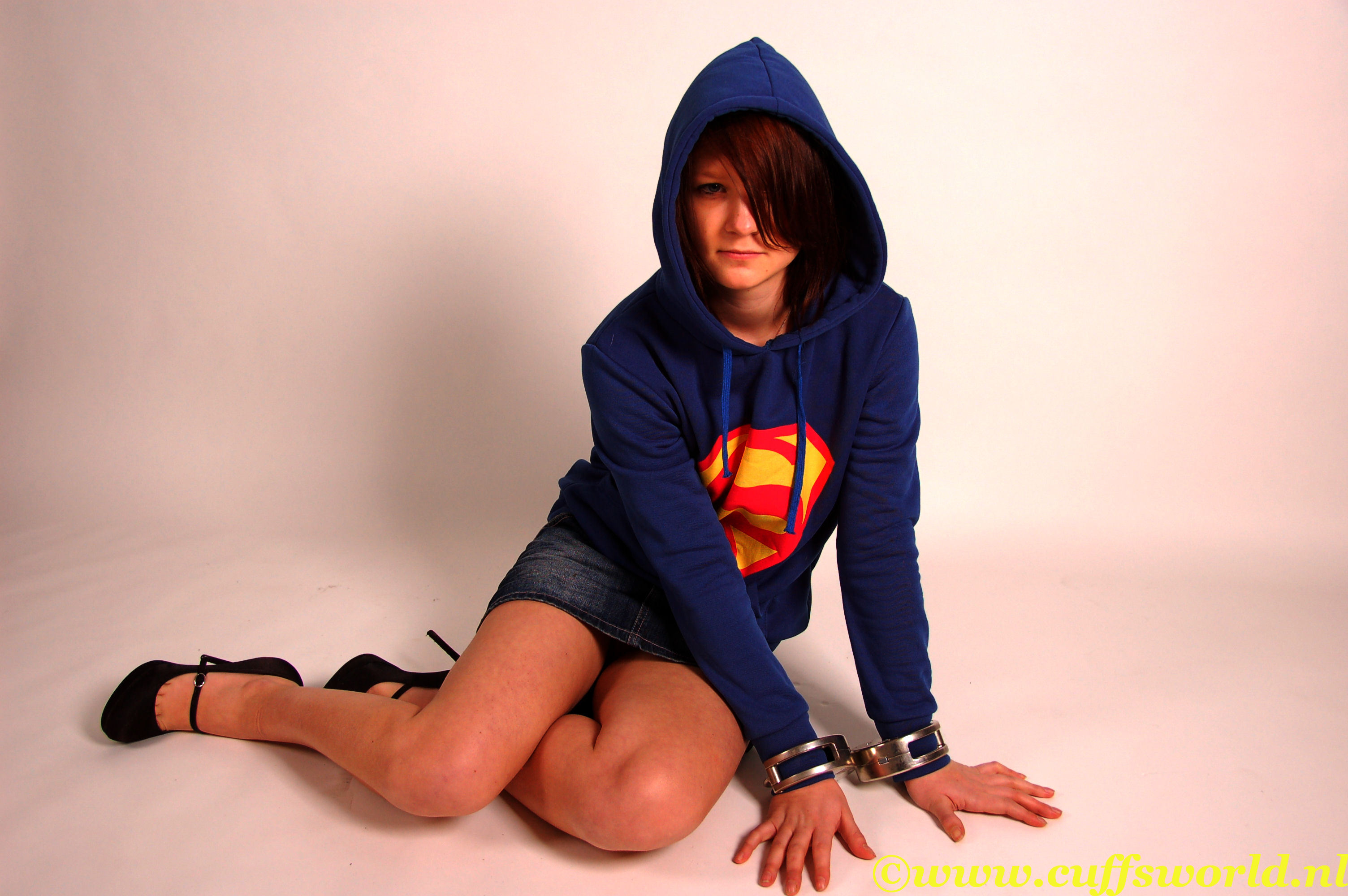 Our cute model Marija was wearing a nice jeans skirt. We asked her to look in our wardrobe to search for a nice hoodie. She came back with a blue superwoman hoodie, she looks lovely in it. But for that kind of hoodie we needed a super handcuff. Guess witch handcuff of the cuffsworld collection we choose ! Of course the heavy weight Clejuso-15.